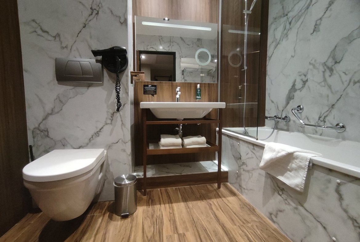 The hotel offers adapted double rooms and a junior suite, designed with wheelchair users in mind. Rooms feature step-free access, large turning spaces, walk-in showers with grab rails, shower seats, and bright flashing alarms for emergency notifications. A large-button remote and phone, a light alarm clock, and a visual doorbell alert are available on request.